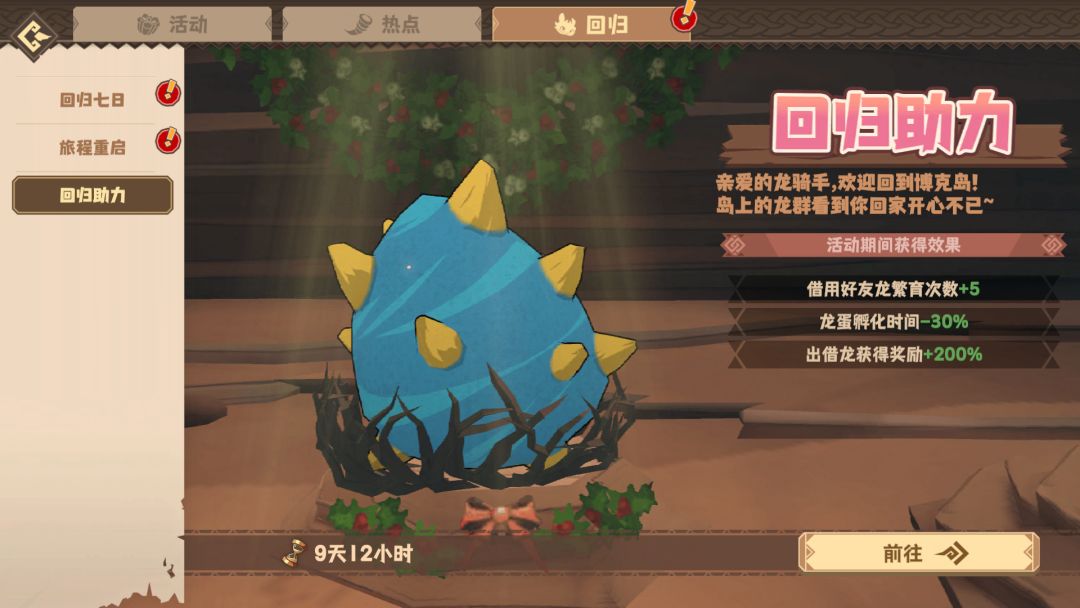 此外,在【回归助力】活动持续时间内,龙骑手们可以在育龙温泉中借用好友龙繁育的次数将额外增加5次,同时龙蛋孵化时间将会-30%,出借龙可以获得的奖励+200%。