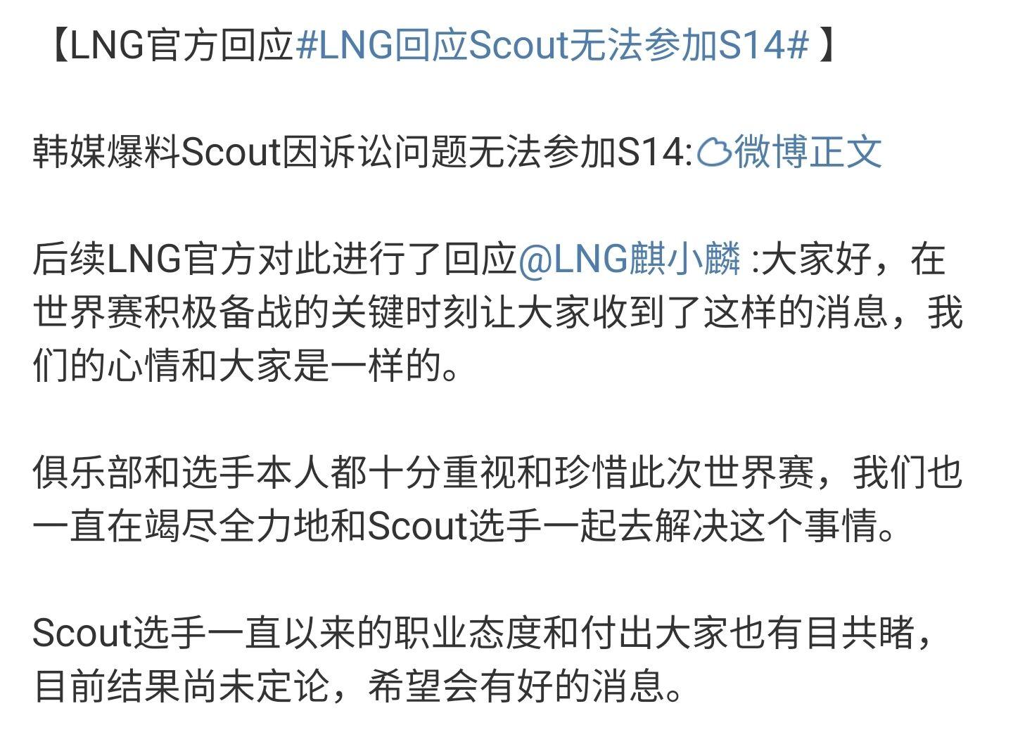 最近EDG和Scout的合同纠纷似乎要有结果了,有消息传出Scout可能无法参加这次S赛了,大概就是因为和EDG的合同有违约可能会停赛了,LNG目前的回应是:大家好,在世界赛积极备战的关键时刻让大家收到了这样的消息,我们的心情和大家是一样的。