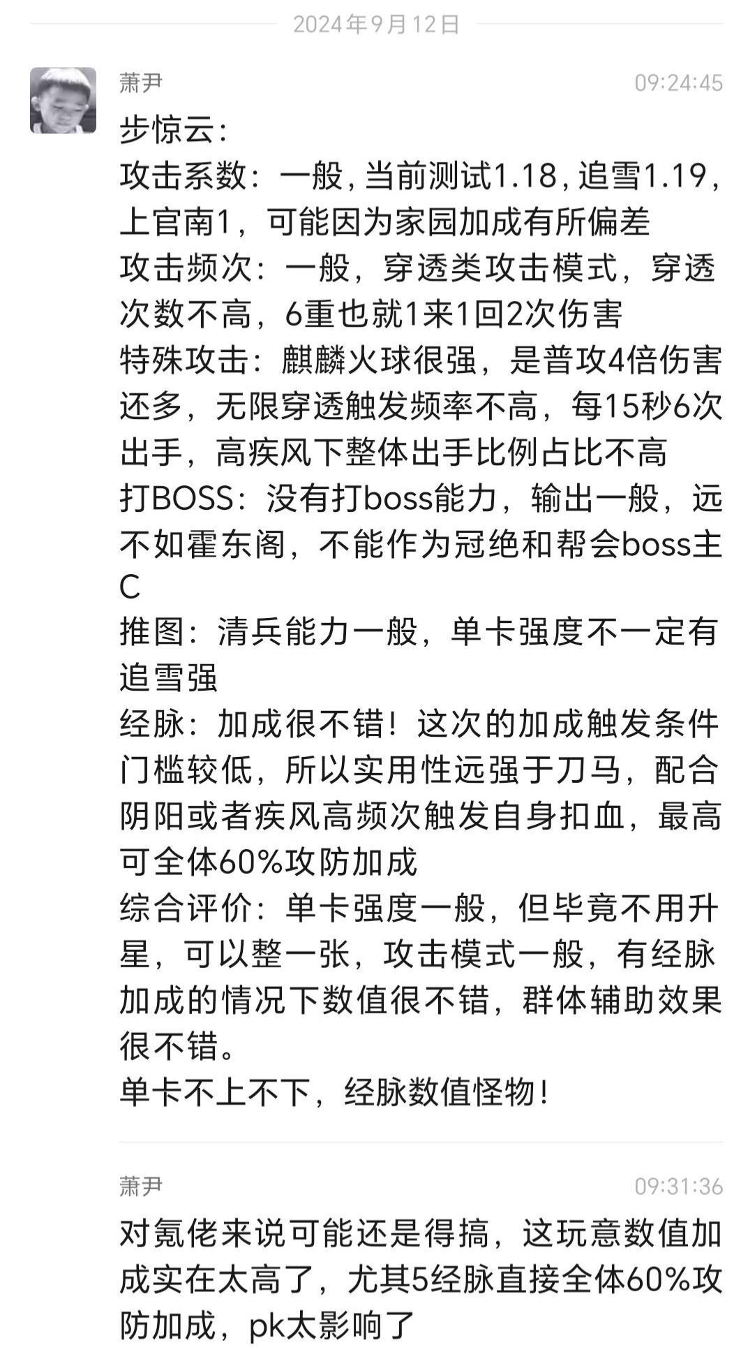 高经脉的步惊云数值大涨,开始追上追雪霍东阁,但是依旧建议把高经脉步惊云给霍东阁做副C辅助用,能抗能辅,回血多、对主C提升很大。