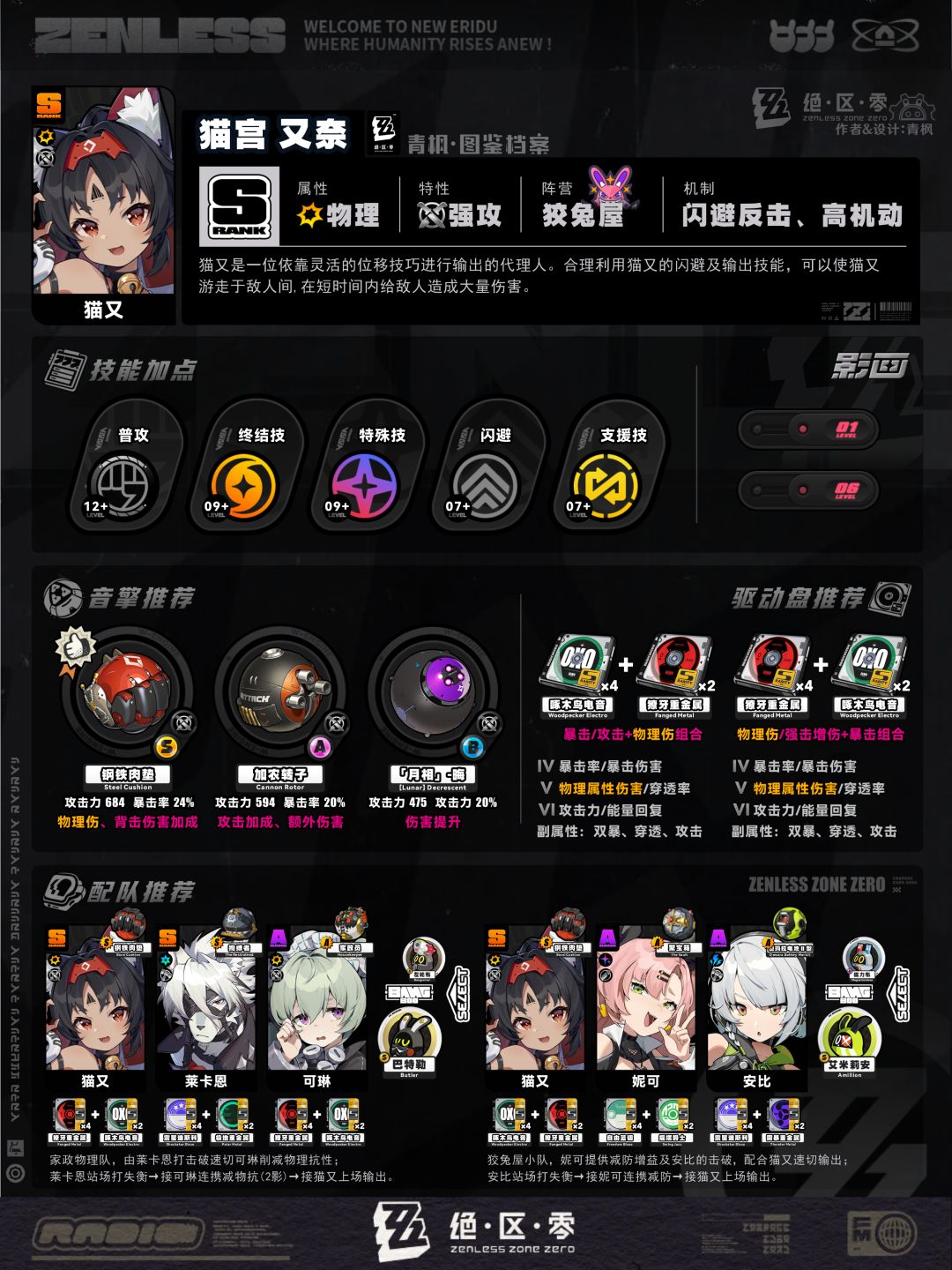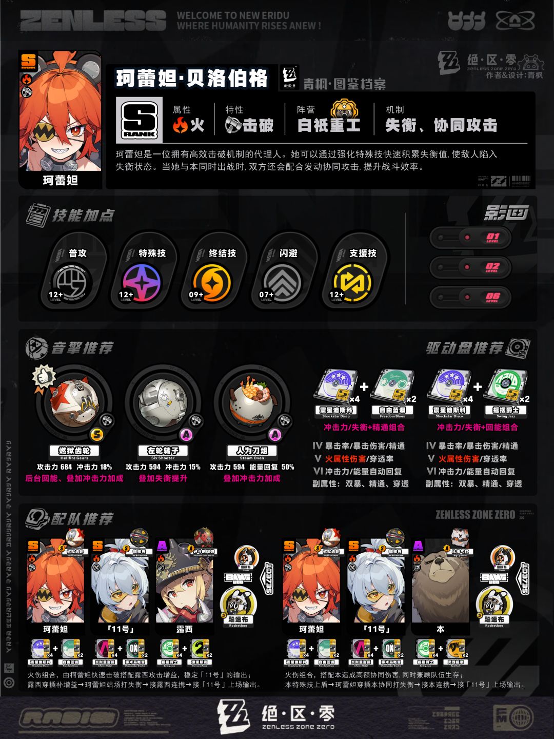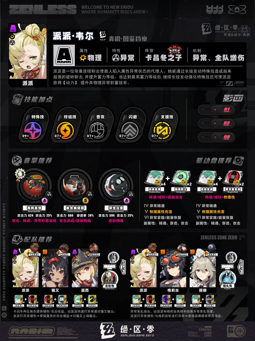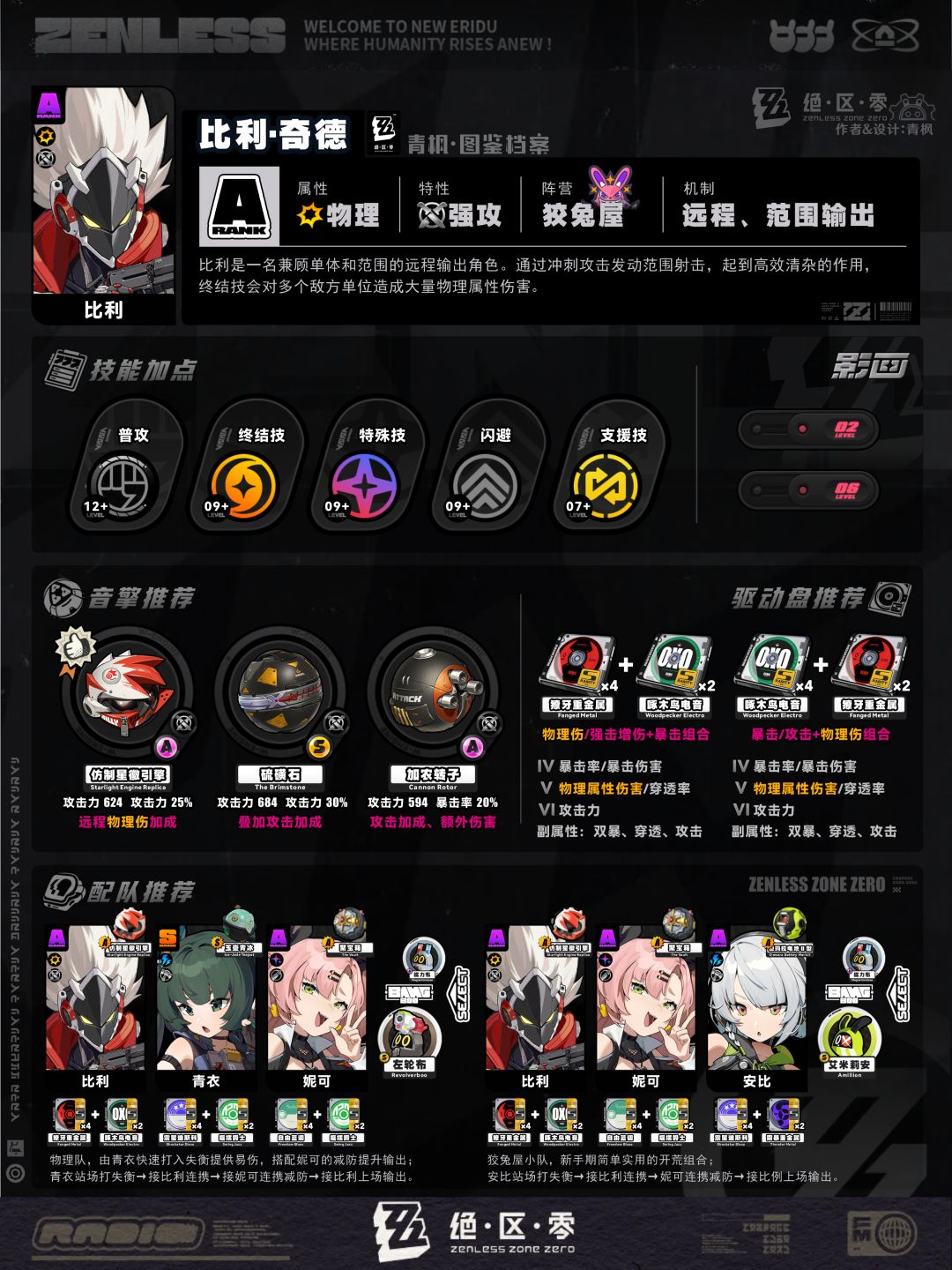 5、配队板块:列举2组相对推荐的阵容及邦布搭配,简要概括各角色的职责,并附上各自推荐的音擎、驱动盘以供参考;