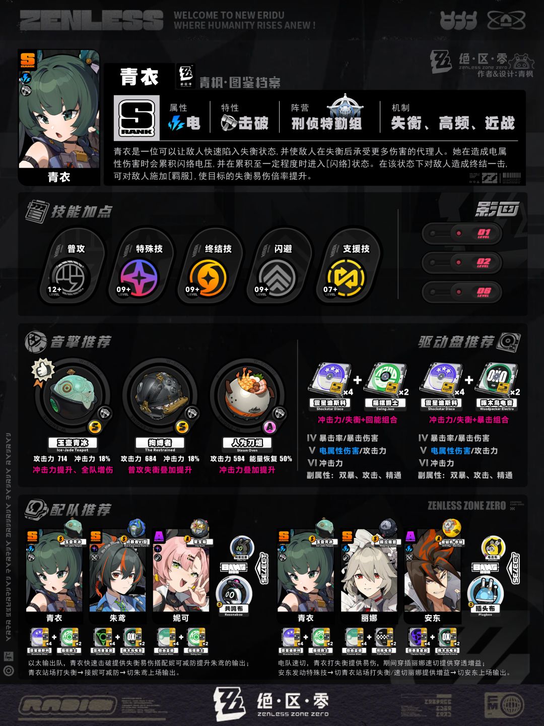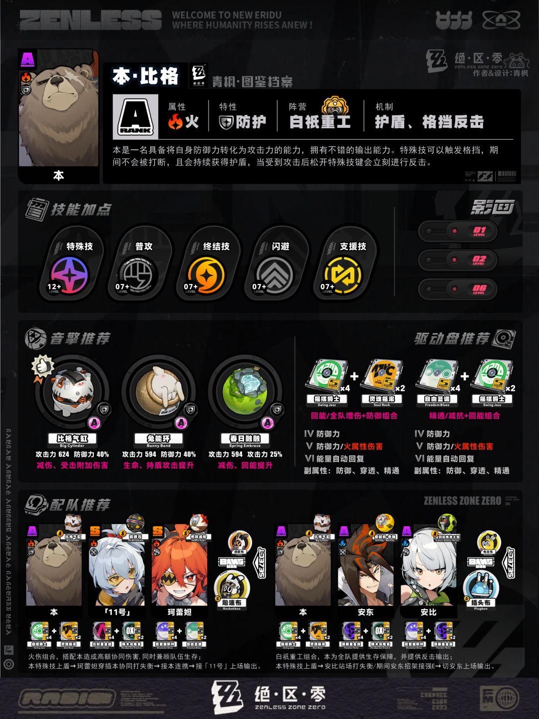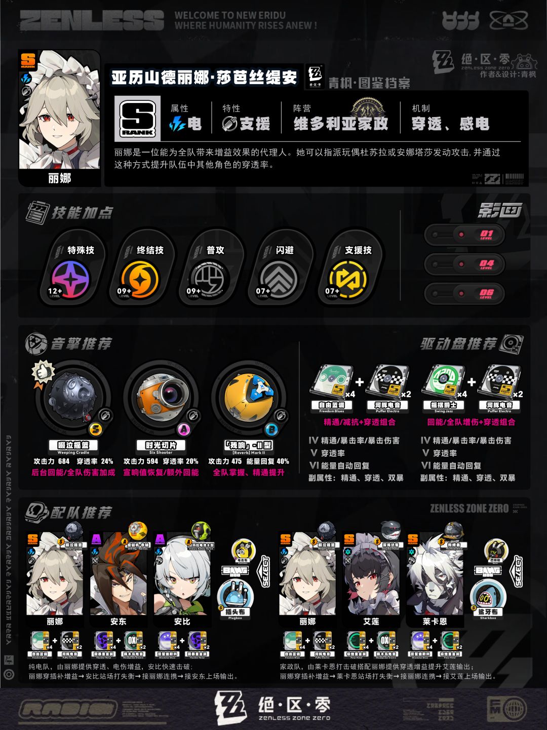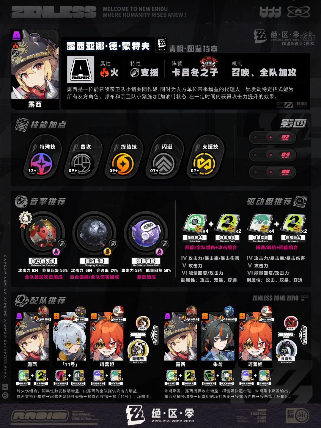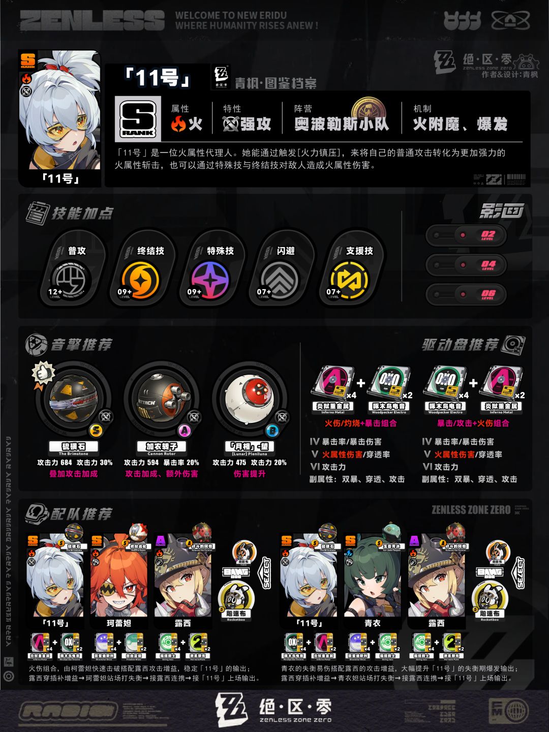 5、配队板块:列举2组相对推荐的阵容及邦布搭配,简要概括各角色的职责,并附上各自推荐的音擎、驱动盘以供参考;