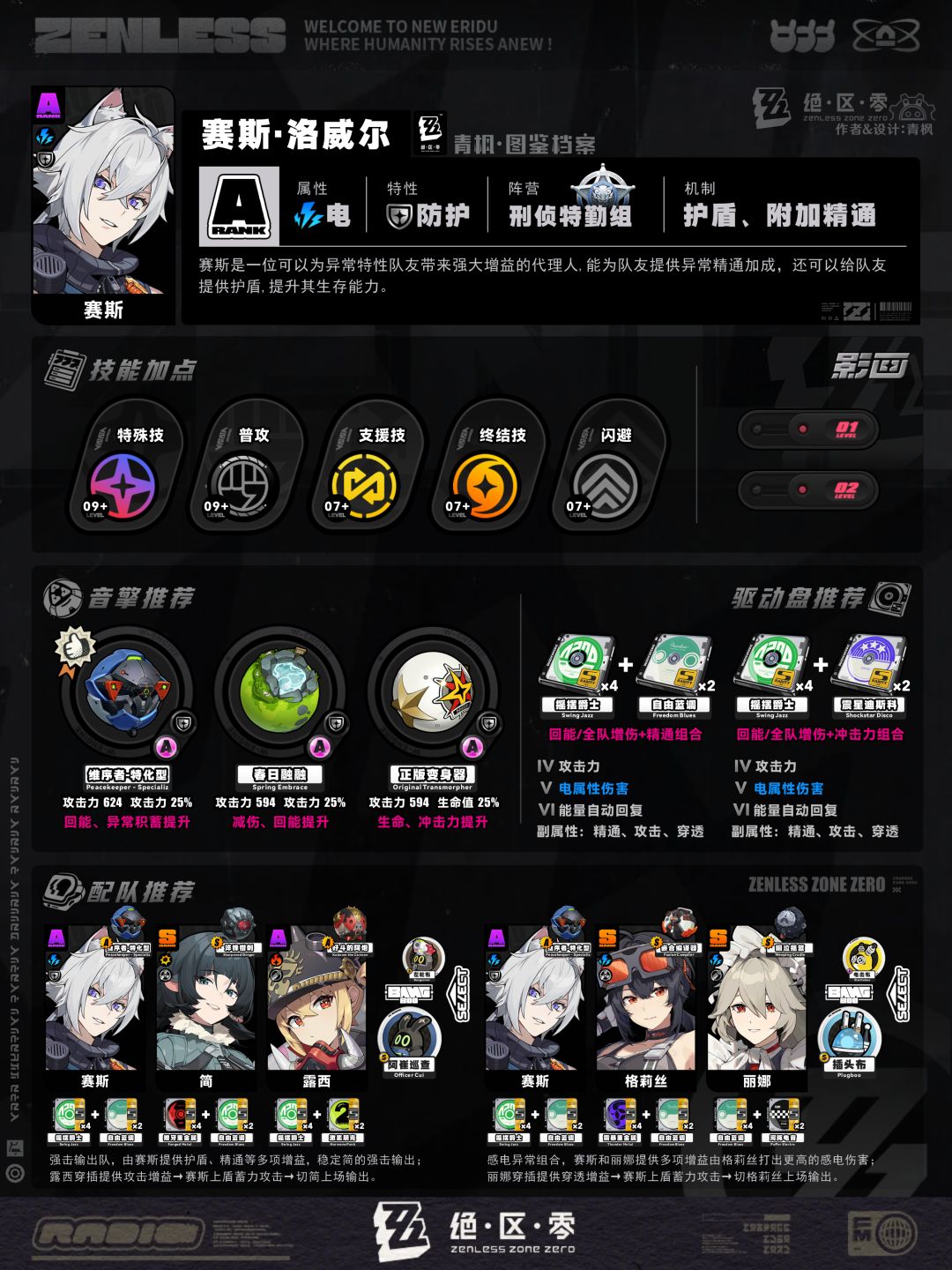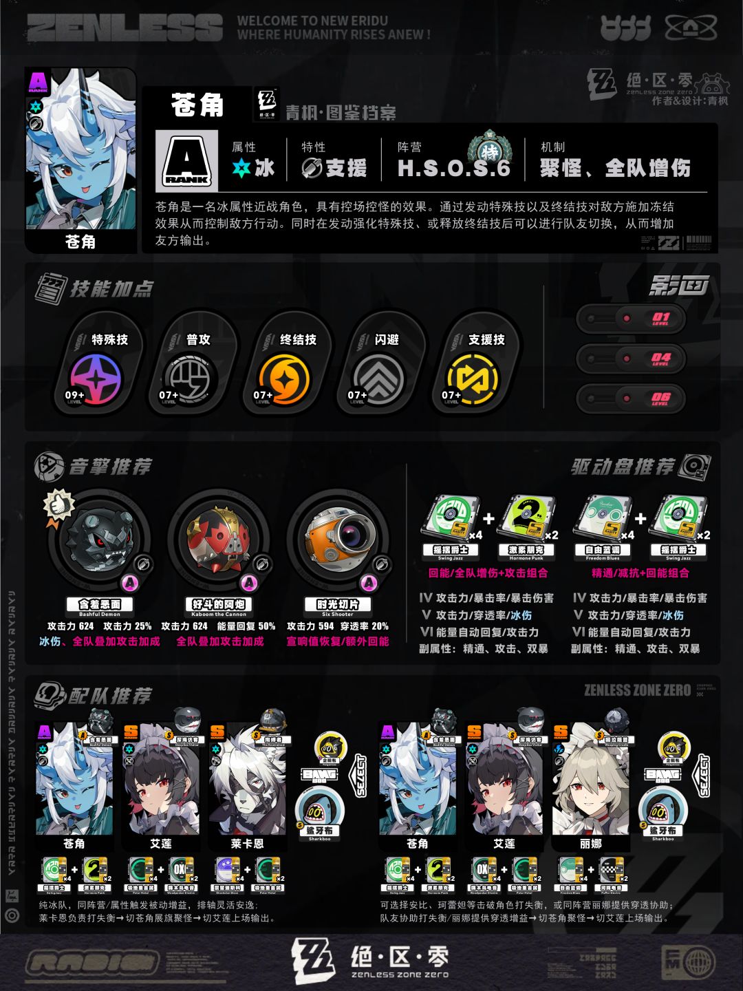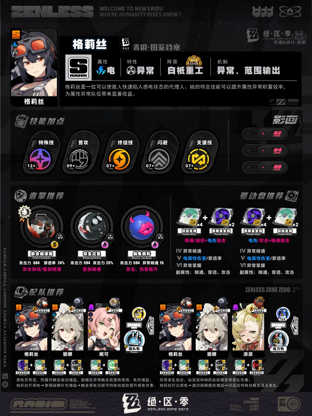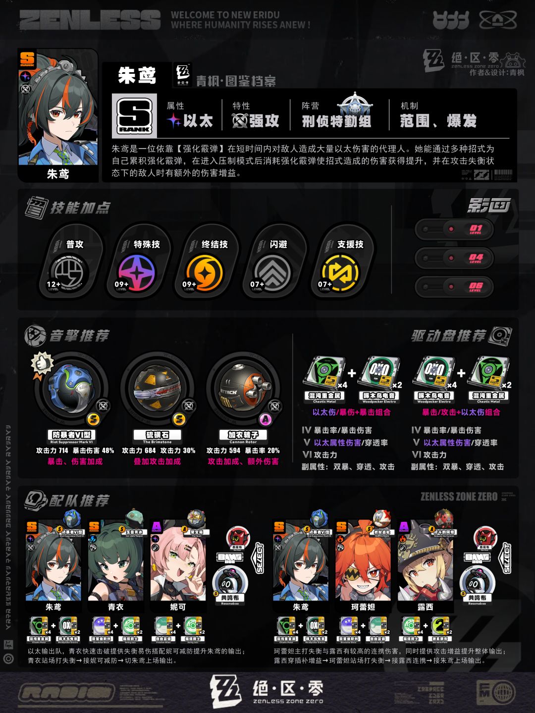 5、配队板块:列举2组相对推荐的阵容及邦布搭配,简要概括各角色的职责,并附上各自推荐的音擎、驱动盘以供参考;