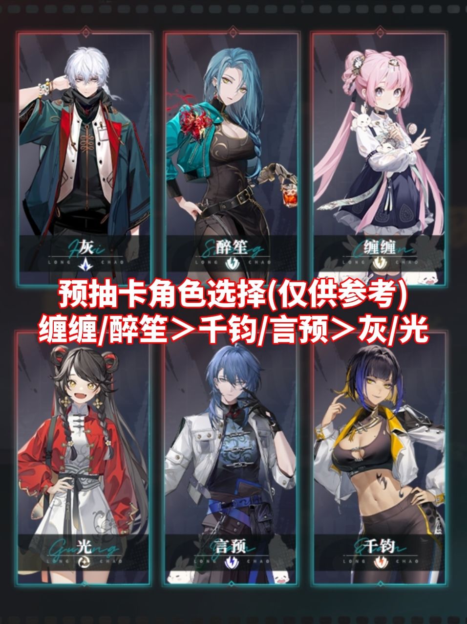 角色选择推荐:缠缠/醉笙>千钧/言预>灰/光(仅供参考)