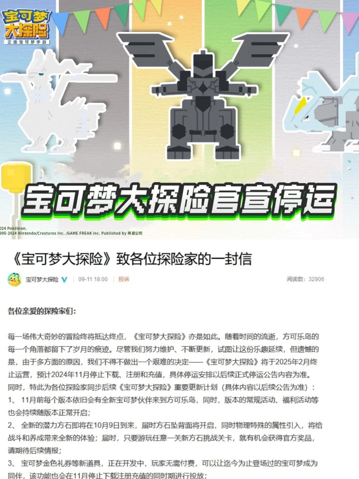 9月11日,由网易运营的“方可梦“《宝可梦大探险》官宣停运!