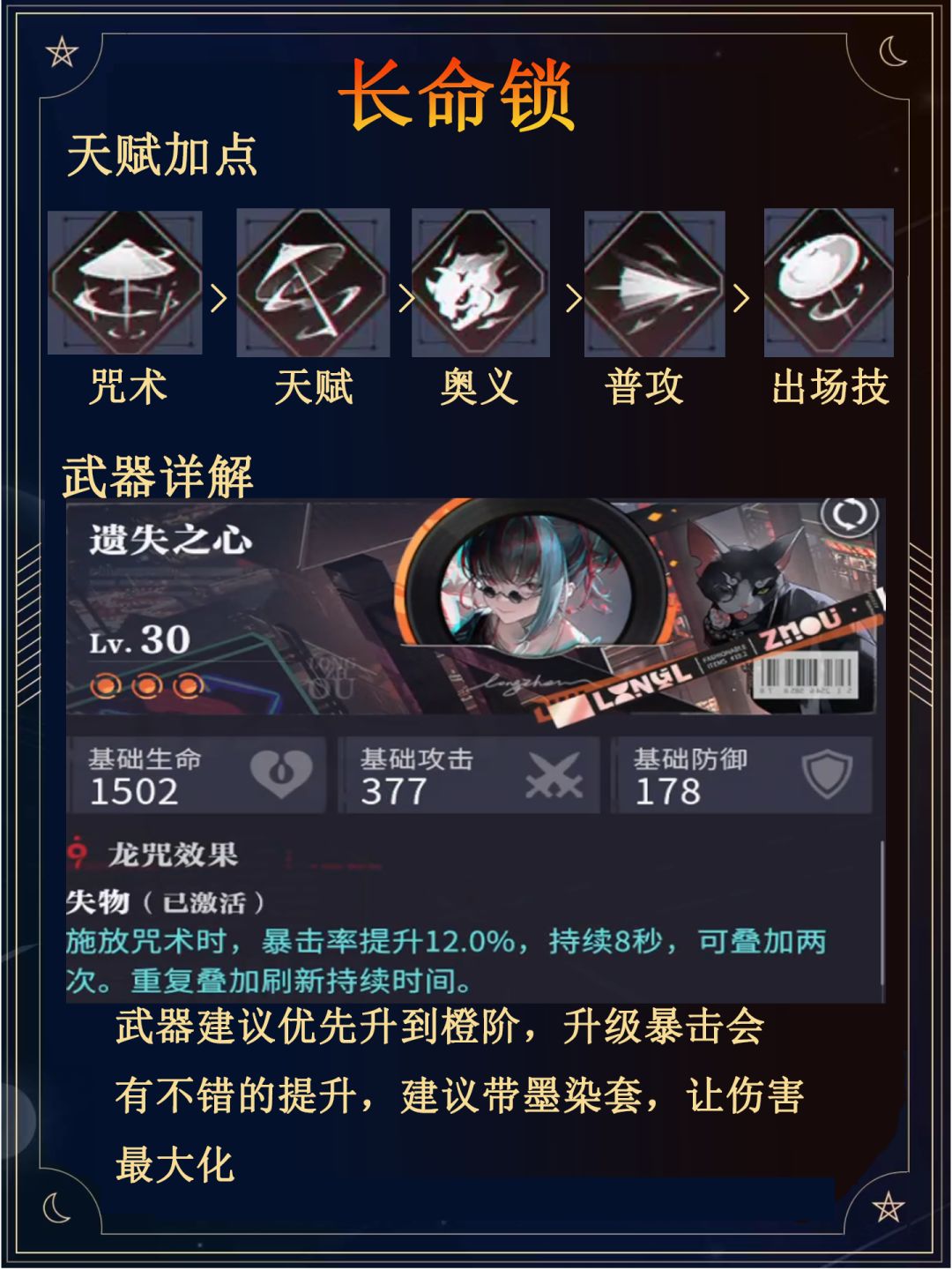 武器建议优先升到橙阶,升级暴击会有不错的提升,建议带墨染套,让伤害