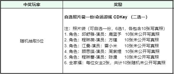 注:实物奖预计10月份陆续寄出(如遇不可控因素,如快递管控等原因,将会推迟发货时间),实物奖励仅限中国地区邮寄;CDKey奖励将于《命运游戏》正式发布当天发放。