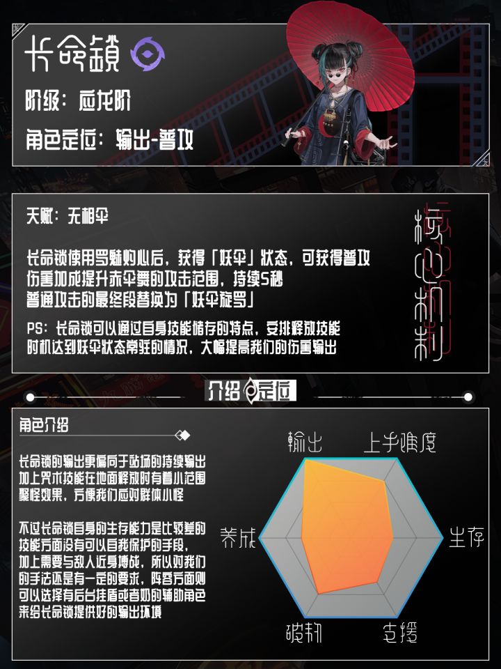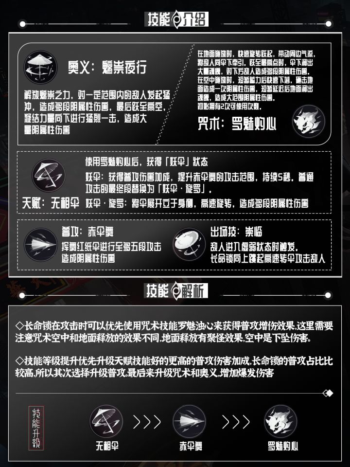技能方面我们只需要掌握好咒术技能的释放间隙,保持长命锁的妖伞状态即可,可以对我们的普通攻击造成提升非常高的伤害。