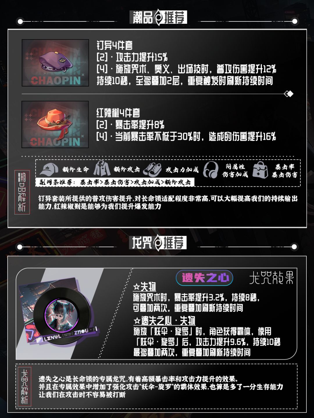 潮品这里是比较推荐钉异4件套,这一套也是非常适配长命锁的攻击特点,与红辣椒暴击属性所带提高的整体伤害对比,钉异的普攻增伤可以叠加两层,加上咒术技能CD短可以多次释放,几乎不用担心持续时间的问题。