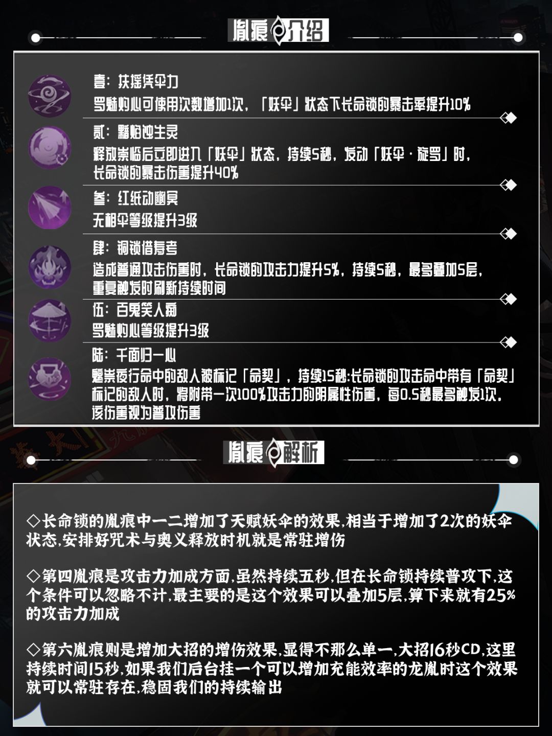 胤痕的提升方面可以算的上是对长命锁的锦上添花,多余的咒术次数可以让我们更加随意的来安排技能轴,不用担心增伤空档导致伤害断层的情况出现。后面更是与普攻大招连携增加攻击力加成和追加攻击,来拉高长命锁的输出能力。