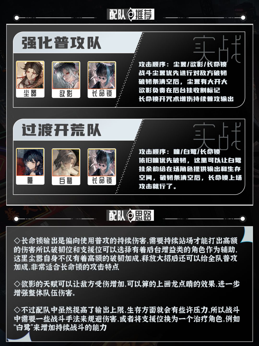 队伍中我们采用最简单的组成方法,破韧/支援和输出。长命锁作为输出位,这里破韧选择尘嚣是因为他的大招有着普攻增伤的效果,长命锁所需要的就是这种后台增益,当然由于是同为应龙阶龙胤获取难度不低,我们前期也可以用主角瞳来担任破韧位,咒术技能还可以给场上角色套盾确保生存能力。支援位欲影负责挂标记使敌人受伤加重。ps:角色数据来源内测,具体以正式服为准#归龙潮公测攻略征集 #归龙潮公测打卡 #归龙潮