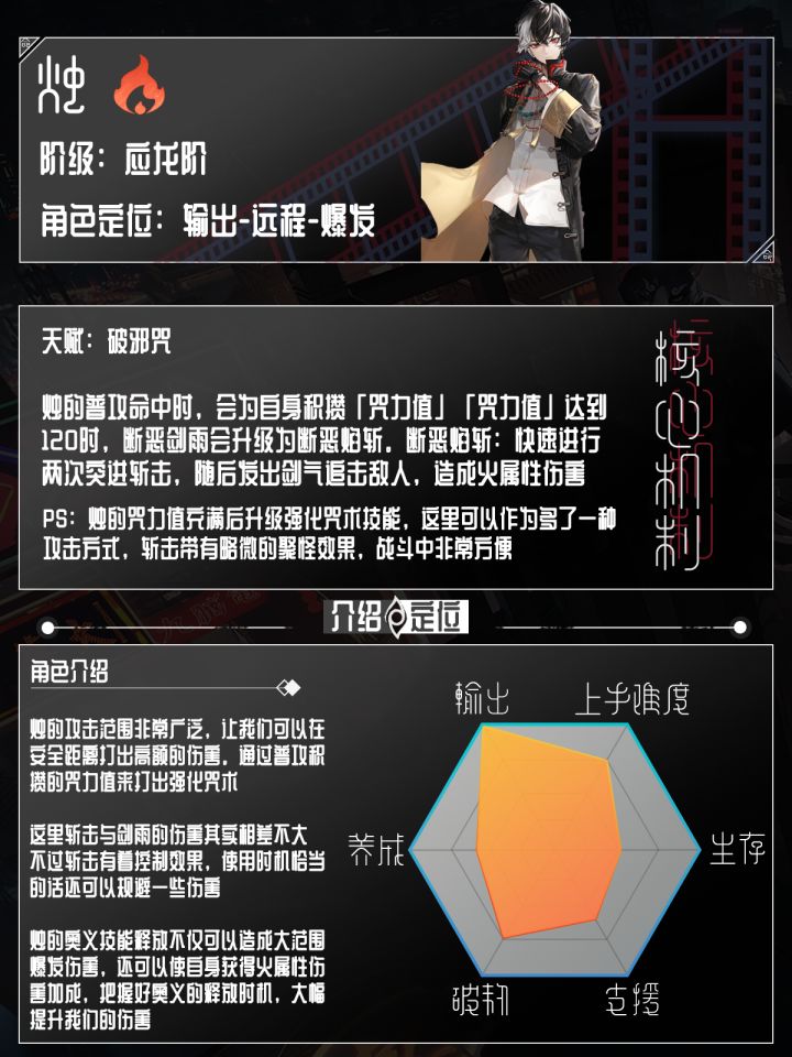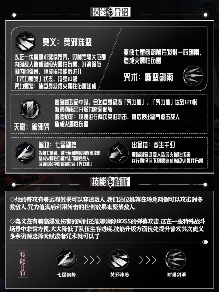 烛的技能比较全面,咒术技能剑雨可以对面前敌人造成多段式伤害,再利用普攻叠加咒力值将剑雨变为斩击,斩击是有一定的控制效果,可以非常轻松的聚拢敌人集中攻击。大招不仅作为一个高爆发的伤害技能,还可以消除弹幕攻击,让我们提高生存空间,附加的咒力爆发状态也是大额提高了火属性伤害,后续的技能循环输出更加饱满。