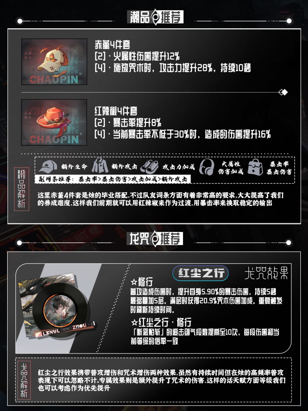 潮品优选赤堇4件套,赤堇的火属性伤害加成和攻击力加成对于烛来说有着非常大的提升,不过暴击词条会比较有压力。而暴击率不足时可选择红辣椒来过渡,暴击率所带来的增伤对于烛来说也是非常可观的。