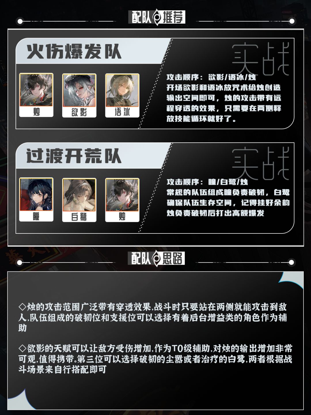 队伍由破韧支援和输出或者双支援来组成,烛作为输出,破韧可以用尘嚣,高额的破韧效率往往可以非常快速的击倒敌人,加上他的大招可以让烛提高普攻伤害,是非常恰当的同伴。还可以用语冰来增加烛的大招充能效率,让烛的咒力爆发可以持续覆盖自身,当然欲影也是必不可少的一个重要成员,咒术的受伤加重效果无论在何时都非常有用。ps:角色数据来源内测,具体以正式服为准#归龙潮公测攻略征集 #归龙潮公测打卡 #归龙潮