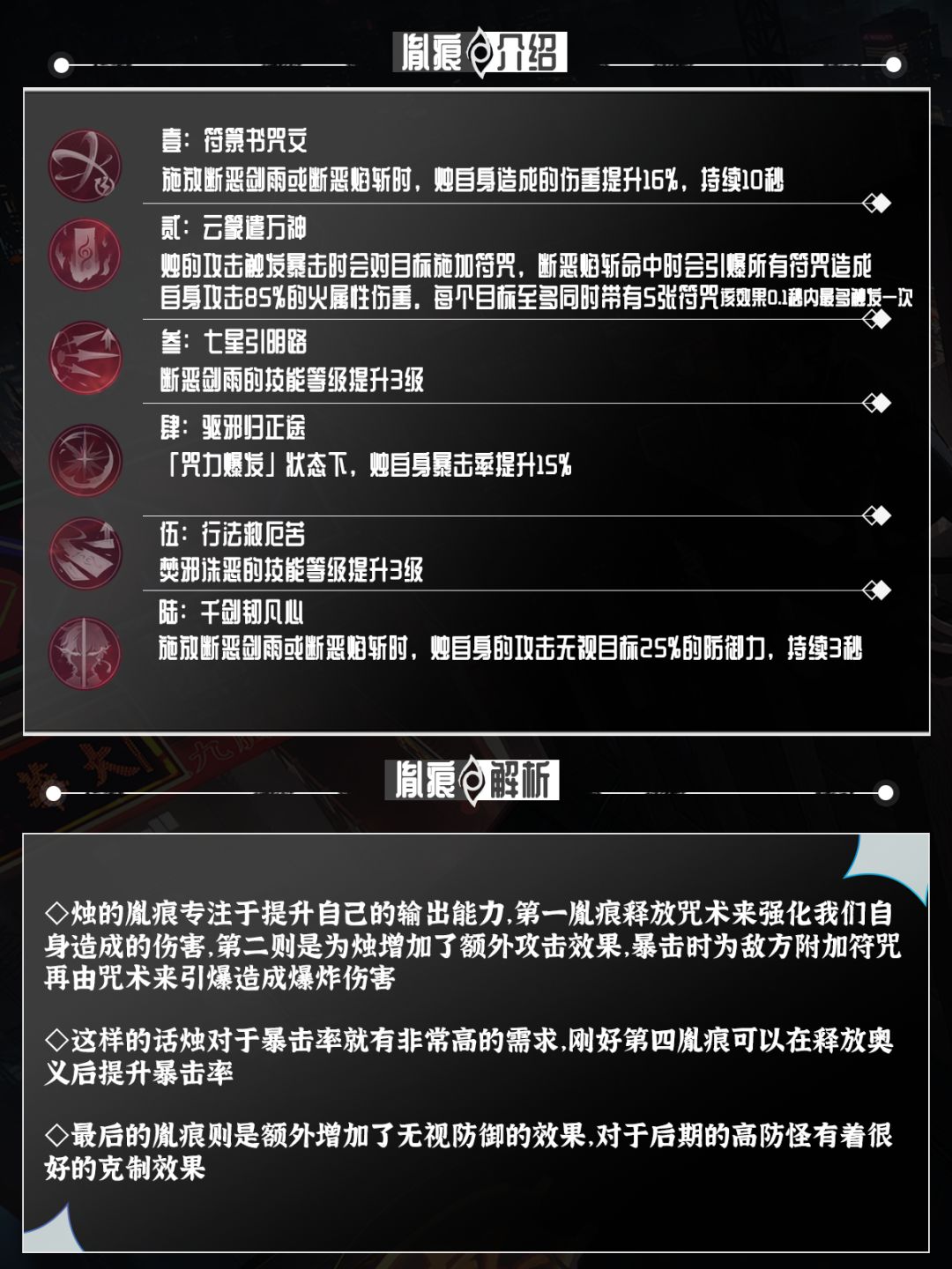 胤痕的提升方面释放咒术后还可以额外提高伤害加成,为自己的暴击攻击附加了额外效果多了一下持续输出的能力