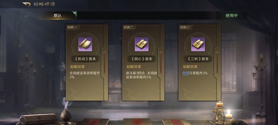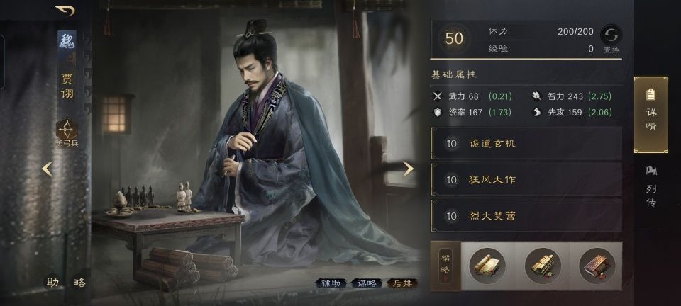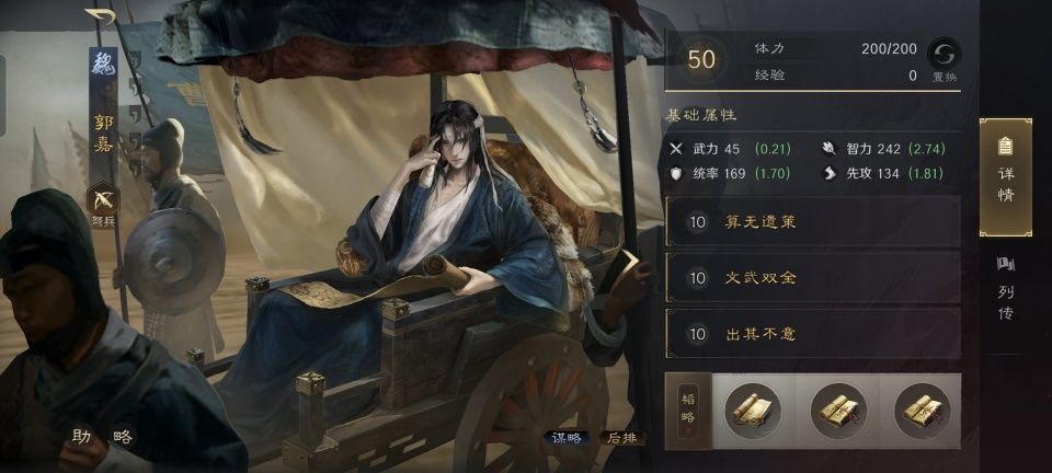 郭嘉战法:算无遗策+文武双全+出其不意。韬略库:机动善本+励心善本+三听善本。弩兵特性劲弩,专精点亮釜底抽薪。贾诩是郭嘉智力最高的友军,顺理成章吃到6%的主动战法发动率提升,烈火焚营的发动率涨到了51%。郭嘉自身结合其兵书,则是文武双全和出其不意的发动率分别被提升到了79%和69%。