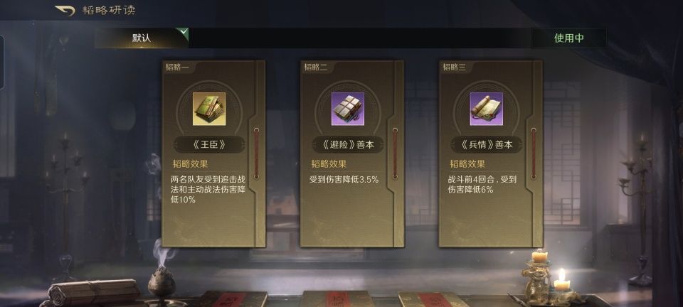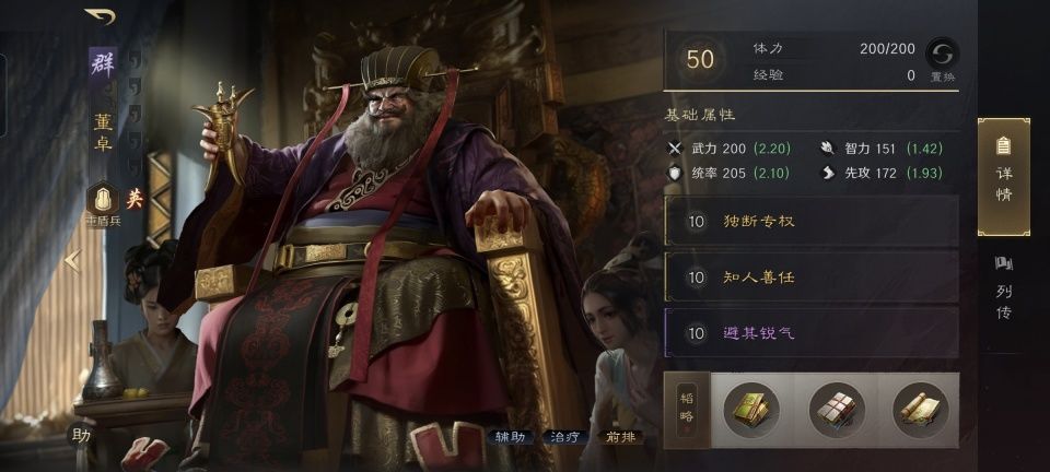 话本董卓战法:独断专权+知人善任+避其锐气。韬略库:王臣(专属)+避险善本+兵情善本。中盾兵特性不屈,专精点亮步步为营。这支队伍智力值最高的角色是贾诩,故而吃到话本版董卓携带知人善任增益的人也是贾诩。这对于贾诩来说,是个相当坚实的保护。身处箕形阵前排的话本董卓,足以承担起守护全队的重任。