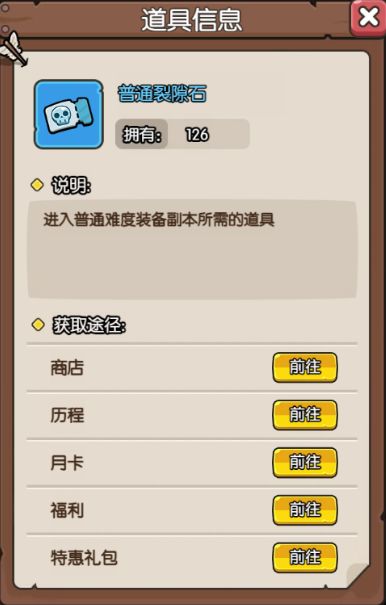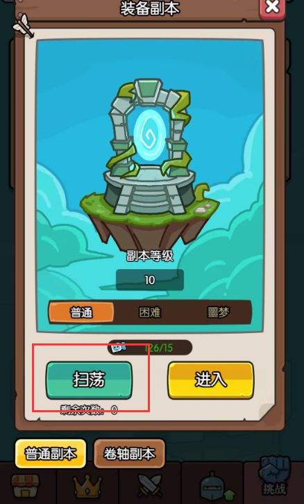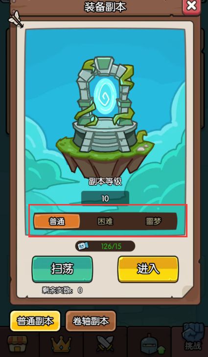【副本门票】门票道具:【普通】需要使用普通裂隙石,【困难】需要使用困难裂隙石,【噩梦】噩梦裂隙石,【普通】【困难】裂隙石都是可以经由各类活动奖励,或每日活跃就可以获得的,【噩梦】可以通过商店获得,所有难度的装备副本在通关一次后就可以扫荡了,但每天有固定的扫荡次数