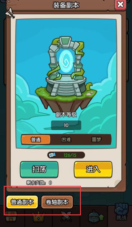 【装备副本】点击打开副本后,就进入了两个副本的选择,【普通副本】【卷轴副本】
