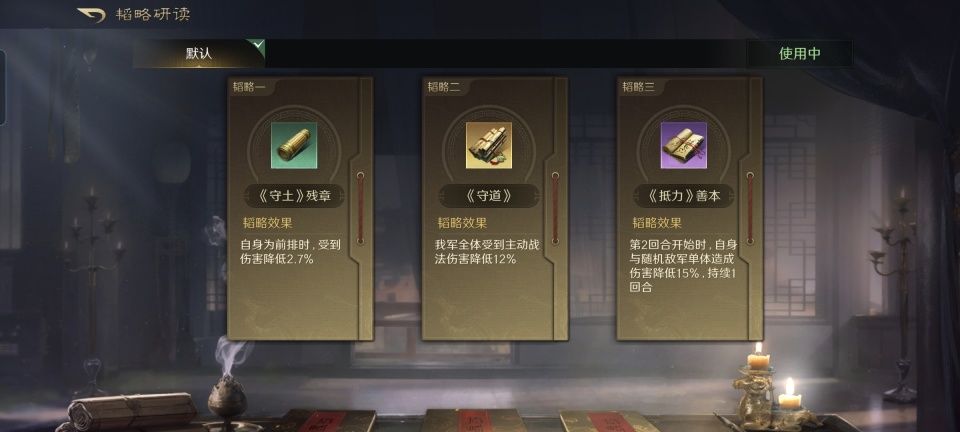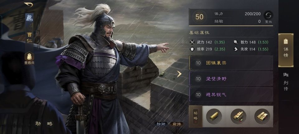 曹仁战法:固镇襄樊+坚壁清野+避其锐气。韬略库:守土残障+守道(专属)+抵力善本。重盾兵特性不屈,专精点亮屹然不动。身处箕形阵前排的曹仁,是技穷、嘲讽、肉盾以及自我恢复的功能都兼顾上了。如此一来,后排的甄洛和夏侯渊才更有安全感。