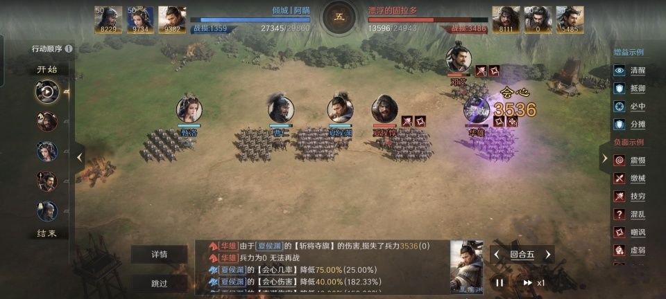 在此特别鸣谢游戏ID名为“倾城丨阿瞒”的玩家朋友,利用麾下的曹仁、甄洛和夏侯渊为我们上演了一场精彩的战斗,也给本文提供了宝贵的创作素材。他们本场面对的,是由夏侯惇、邓艾和话本版华雄组成的敌阵,其中的话本版华雄,更是被提炼到了满红级别。如何在半场阶段取得速胜,接下来的段落将做详细拆解。