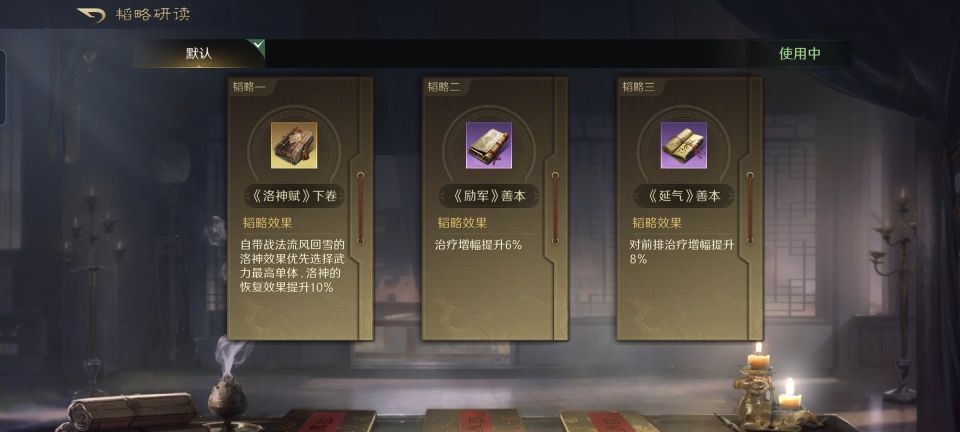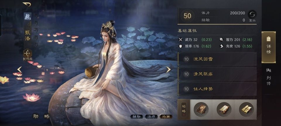 甄洛战法:流风回雪+清风驱疾+任人择势。韬略库:洛神赋下卷(专属)+励军善本+延气善本。长弓兵特性洞悉,专精点亮袍泽同心。通过专属金书,把洛神锁定给了本队伍武力值最高的夏侯渊,任人择势进一步夯实了会心一击的威力。此外,甄洛的治疗增幅也很关键,曹仁会因为她的奶量而更加坚强的存活下去。