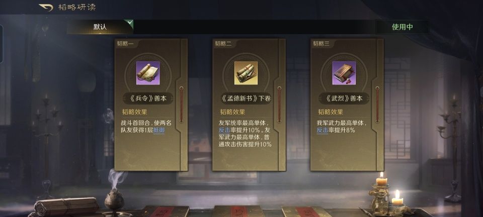 典韦战法:古之恶来+万夫莫当+勇冠三军。韬略库:折武(专属)+军用善本+分合善本。长枪兵特性破敌,专精点亮愈战愈勇。毫无疑问,典韦是本支队伍里武力值最高的角色,故而他同时吃到了大乔披坚执锐和先勇善本的增益效果。为了更多的从大乔那里吸取奶量,军用善本激活了受到治疗效果的提升作用。