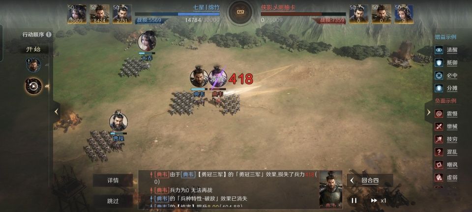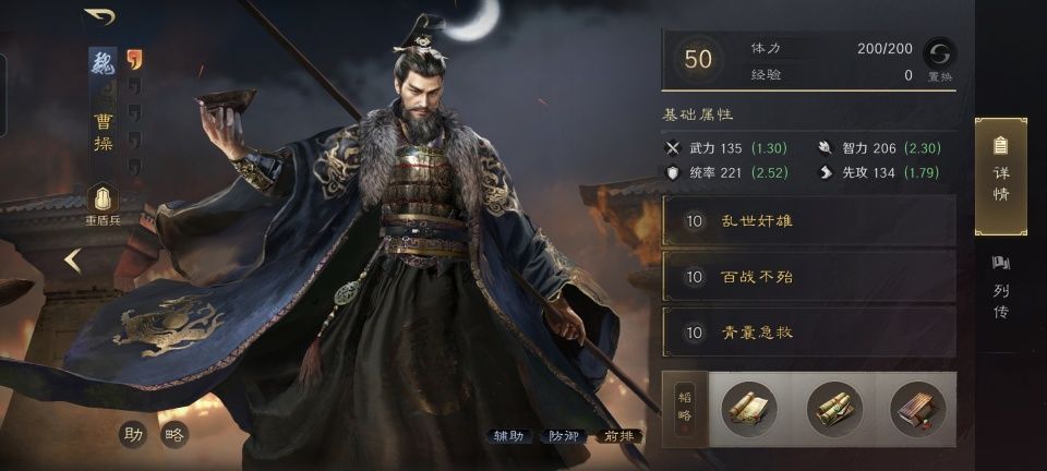 曹操战法:乱世奸雄+百战不殆+青囊急救。韬略库:兵令善本+孟德新书下卷(专属)+武烈善本。重盾兵特性不屈,专精点亮以逸待劳。无论是统率值还是武力值,典韦的数据都要比大乔高,所以他能同时吃到曹操兵书里的各种攻防提升效果。曹操在这里最为关键的战法,相比之下还是青囊急救,可以驱散三种负面状态,这正是典韦最刚需的!