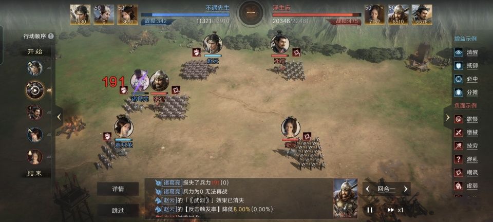 邹氏战法:顾盼生姿+百战不殆+出其不意。韬略库:兵教善本+敌谋善本+世俗(专属)。重盾兵特性不屈,专精点亮屹然不动。此战摆出的是一字阵,所以婶娘、张辽和邓艾受到敌方打击的概率是一致的。婶娘高级兵转成重盾的意图再明显不过,就是想要生存得更久,好给全队提供更多辅助效果。