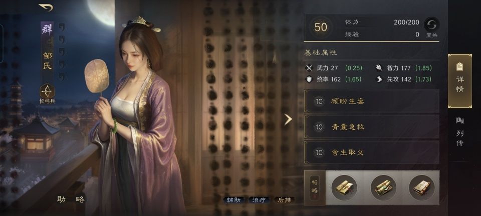 邹氏战法:顾盼生姿+青囊急救+舍生取义。韬略库:延气善本+世速(专属)+励军善本。长弓兵特性洞悉,专精点亮袍泽同心。他们摆出的是锥形阵,婶娘和甄洛都在后排。通过兵书的加持,婶娘对于身处前排的典韦将提供出更多的治疗量。此外,她还兼顾了维持典韦的清醒,为他驱散不良状态和提升其30%连击率的功能。