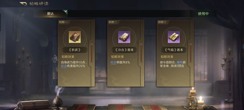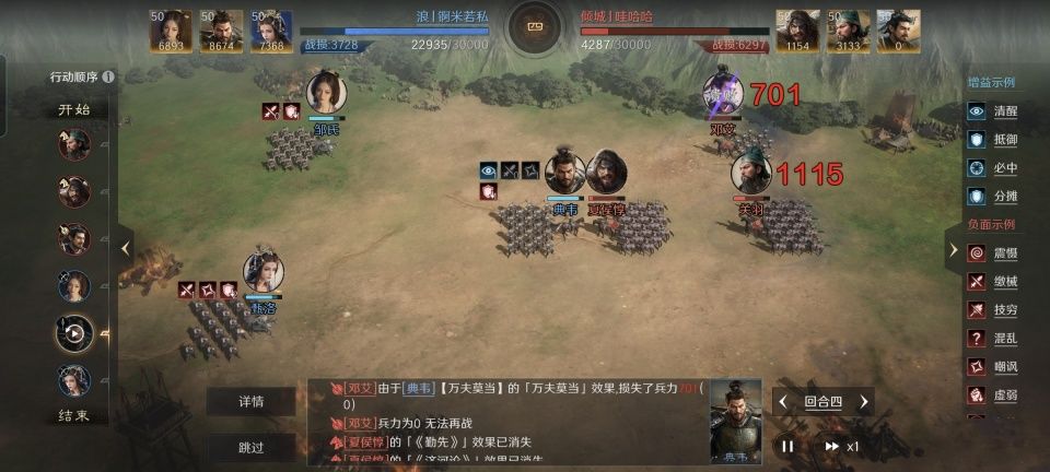 典韦战法:古之恶来+万夫莫当+勇冠三军。韬略库:折武(专属)+分合善本+气临善本。长枪兵特性破敌,专精点亮愈战愈勇。有了婶娘的汹涌奶量,典韦自然要在人设上火力全开,这些都是他的常规配置。唯独气临善本并不多见,这会让典韦主动吸引地方全体的火力,好在婶娘和甄洛都在后面给他兜着底。