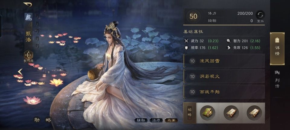 甄洛战法:流风回雪+洞若观火+百战不殆。韬略库:洛神赋上卷(专属)+励军善本+大破善本。长弓兵特性洞悉,专精点亮袍泽同心。从专属金书的配置来看,会发现洛神锁定给了本队伍智力最高的甄洛,以此来加强她的治疗效果。当然也没有完全不顾及典韦,洞若观火和百战不殆是围绕着典韦来的。