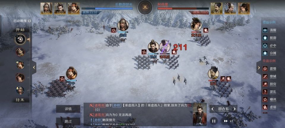 特别鸣谢给本文提供创作素材的玩家朋友,他在游戏里的ID名为“后勤部部长”,我没少写过他的战报,这哥们最大的特点就是喜欢剑走偏锋。后勤部部长此战摆出方圆阵,把徐盛和孙权都安排在前面,甘宁则是在后面加连击。战斗才过半场,诸葛亮就被甘宁第一个打爆了,胜利的天平也毫不犹豫的倒向了这支吴骑。具体的配方和细节,我都给写在接下来的段落了。