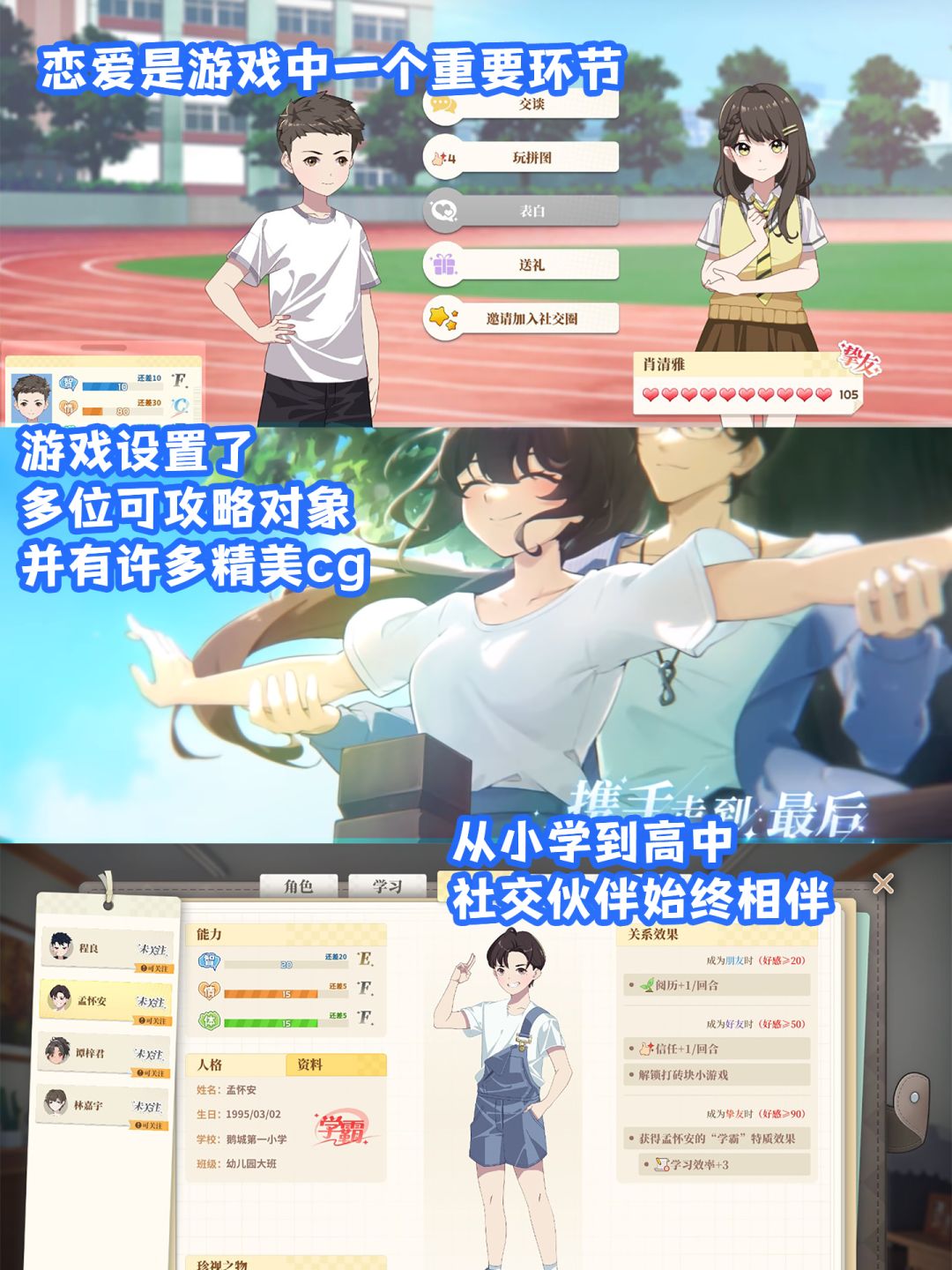 每个回合玩家可以选择前往不同的地点,学习或锻炼提高各种属性,提高成绩成为三好学生💯!或是因成绩差退学成为精神小伙|妹(有可能吗),体育生🏃or情感大师💁,你怎样重新度过你的学生时代?