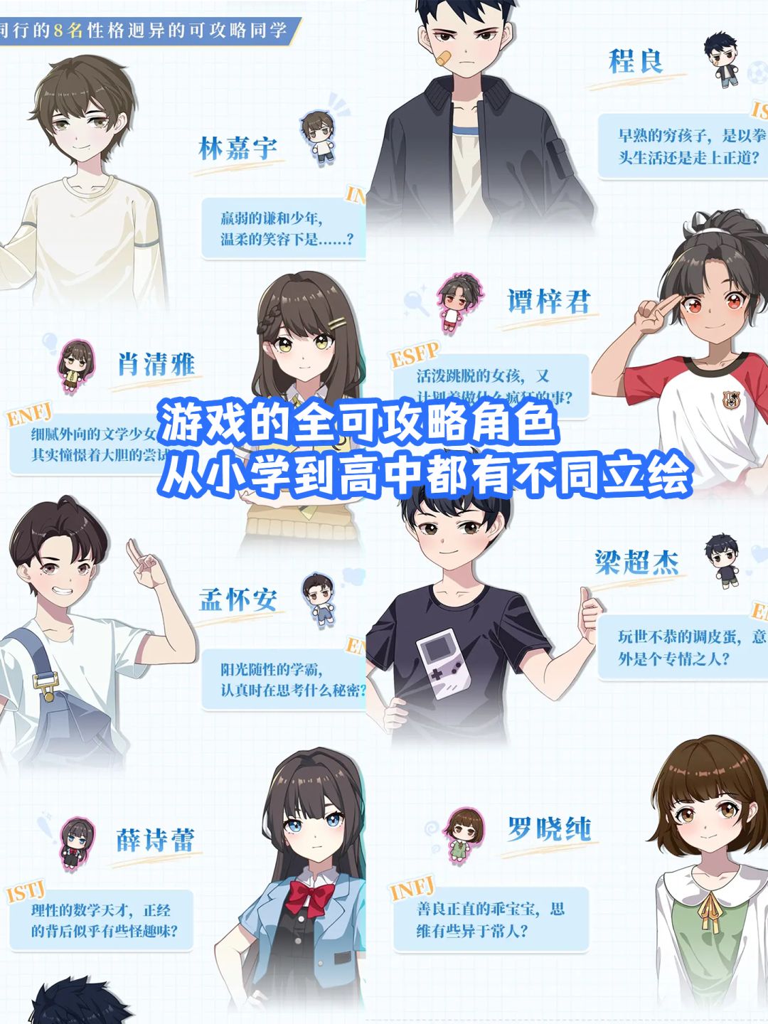 游戏内有四男四女可攻略角色!(详见p6)他|她们也会随着时间成长改变样貌和性格,有想过从小学开始邂逅,展开一段恋爱之旅吗?游戏也精心绘制了许多cg,弥补玩家儿时的恋爱遗憾hhh