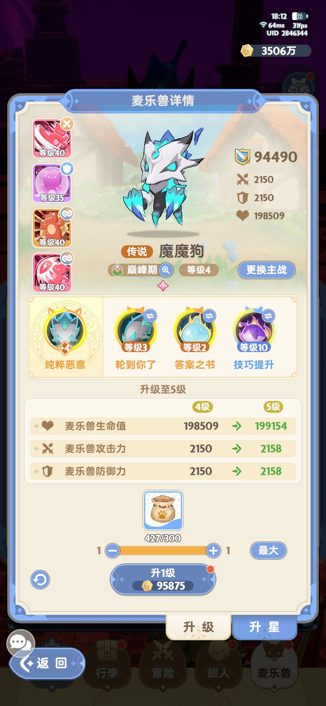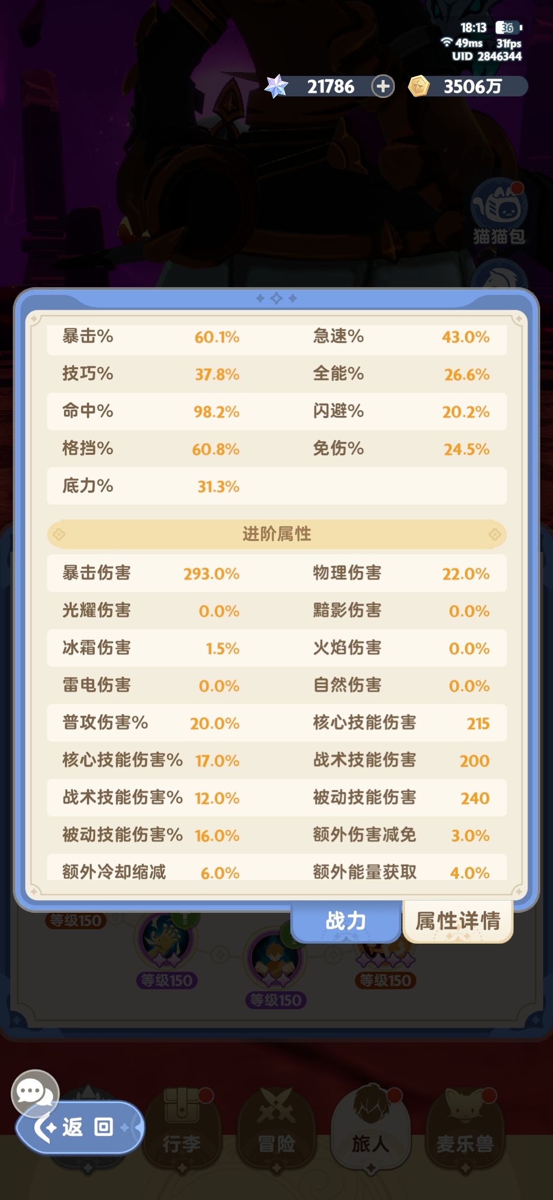 开篇先感谢一下看帖的小伙伴们的支持,本次单通的是第一梦魇中眠域困难难度。过的时候有些激动,忘了截图伤害统计,打boss得时候到了5.5亿秒伤,之前试了几次,少于5.3亿秒伤过也不了。这期是换上红一狗后的单通首秀,所以就聊一聊红1金5金3狗的伤害对比吧。小up到现在为止没有抽齐橙宠,只有智多谋5碎片,所以同等条件下能对比的只有金3 74、金5 44、红1 32,第三个技能带技巧5.5%不变,猫猫超持久不变,测试对象是旅团挑战3-3雷鸟。直接说结论,3分30秒内金3>金5>红1,超过4分半以后红1伤害就会超过其它两个搭配。原因不想研究了,反正觉得带红1狗看着更像大佬,所以我以后就带着红1狗了