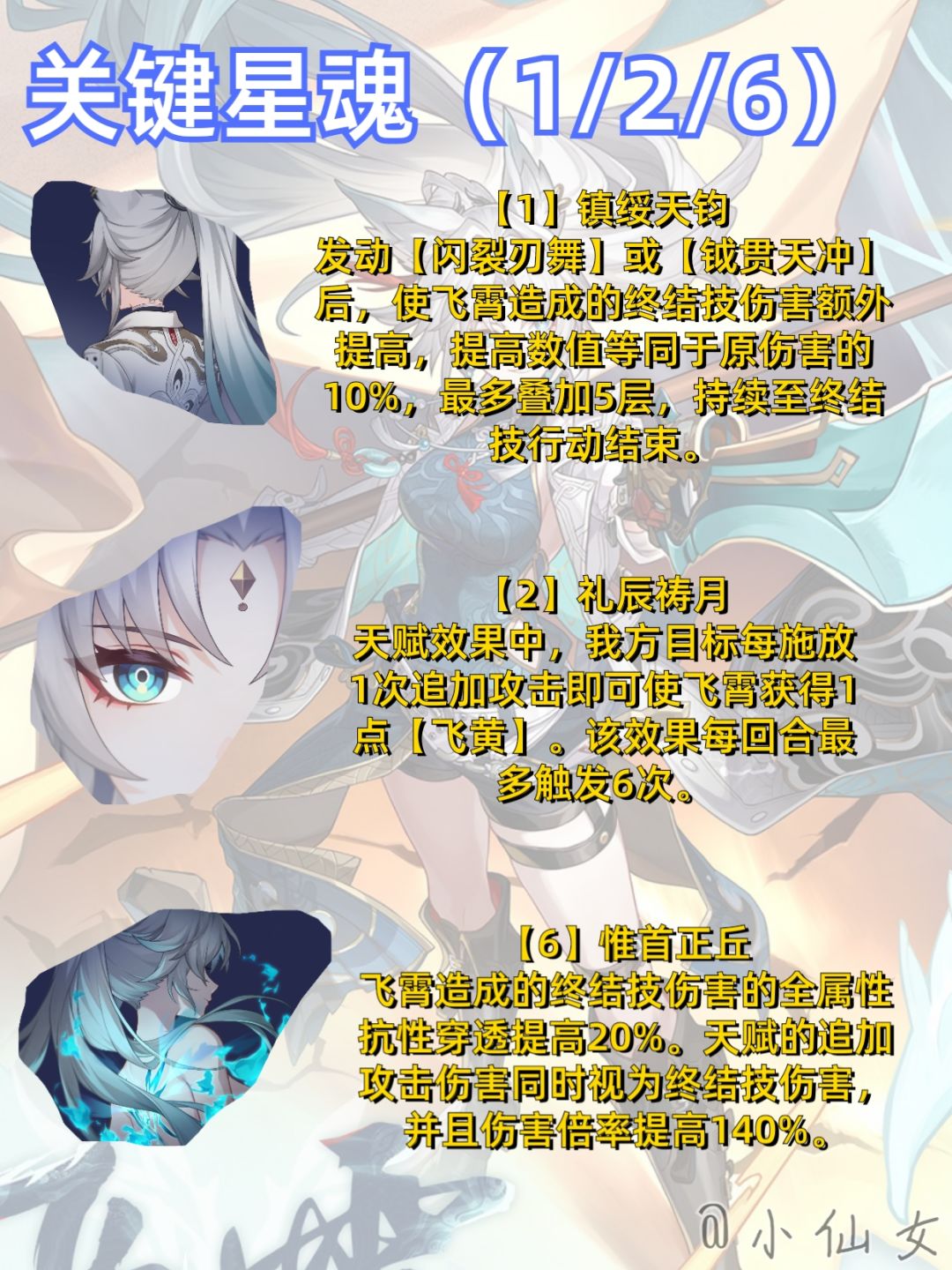 【角色定位】飞霄是通过【飞黄】施放终结技的输出型角色,我方全体攻击即可积累【飞黄】。此外,我方发动攻击后,飞霄还可以对目标发动追加攻击。
