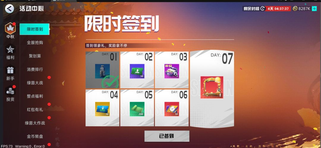 累天连充福利,累充六天均达到648档位即可获取最终大奖。