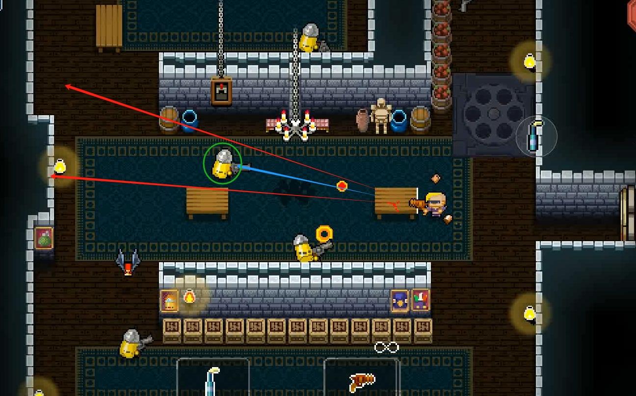 在手动瞄准的基础上,添加一个识别范围,只要怪在这个识别范围内,就自动瞄准,如果出了识别范围,就指哪打哪,而且所有除了怪以外的任何东西都不在瞄准范围内。如果此时有多个怪并排并且都在识别范围内,那么就以手动瞄准的准心为准,喵到哪个就射击哪个。进boss房依旧是这样。因为这样即使我离怪的距离比较远,也可以决定哪个怪先死,而且这种操作也比较像电脑端的射击方式了。