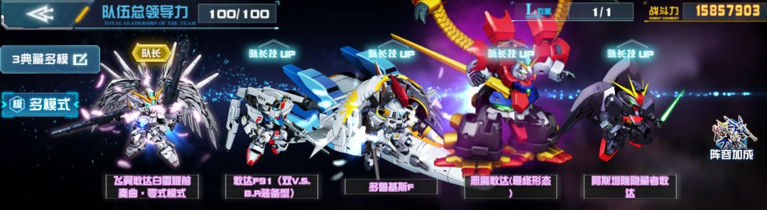 恶魔敢达(最终形态)缘分技能中的清除护盾并再添加护盾效果配合多模队伍中频繁的护盾触发技能,能够保证其在队伍中有一席之地。