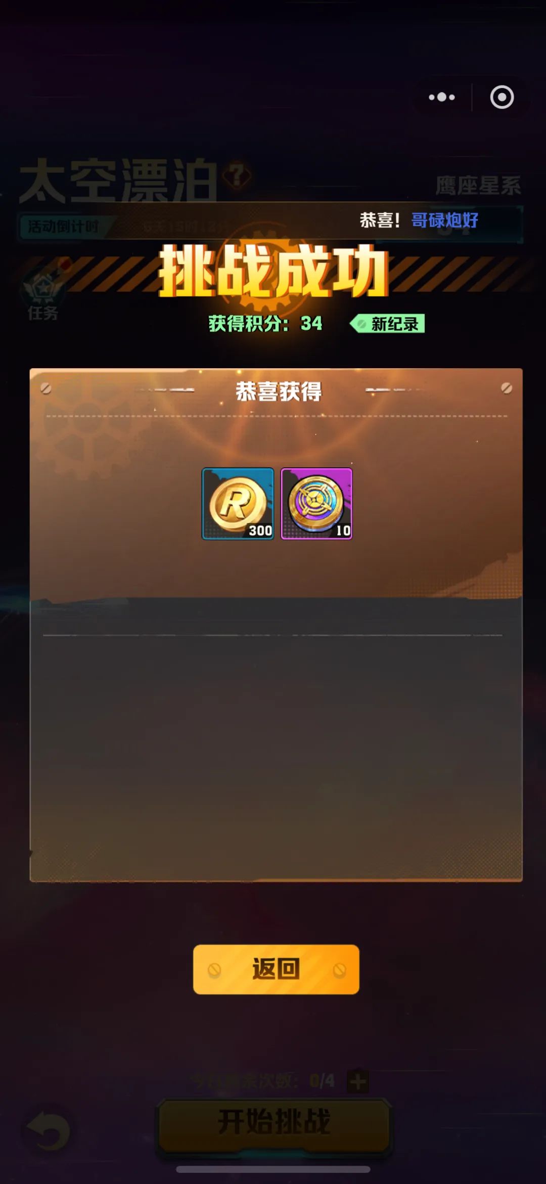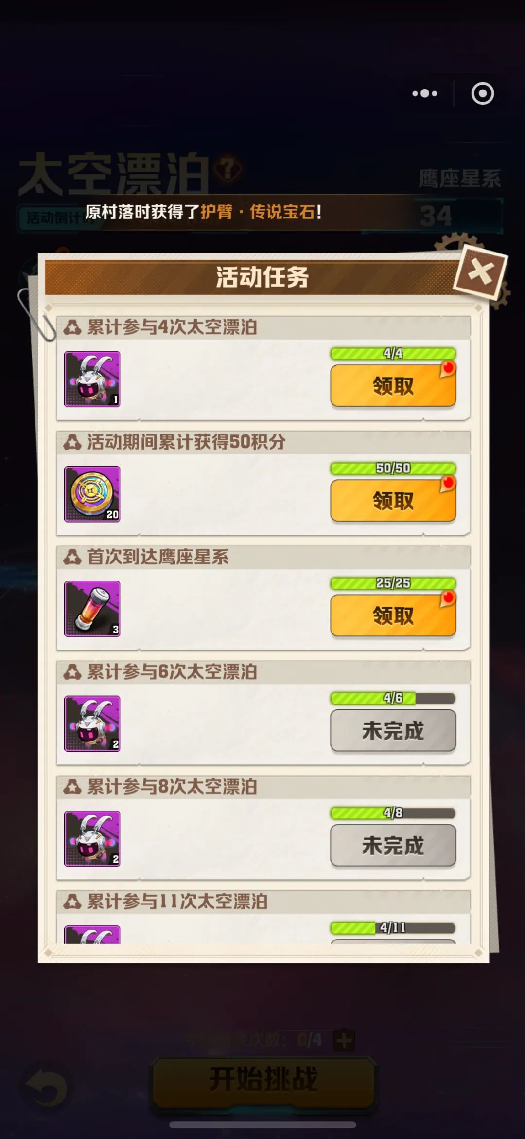 太空漂泊是一个小游戏的玩法,手残党要吃亏咯,它会根据你累计参与次数、积分和到达的星系获得奖励,每次可以获得10个银河币,每天可以挑战3次,20钻石购买一次挑战机会;