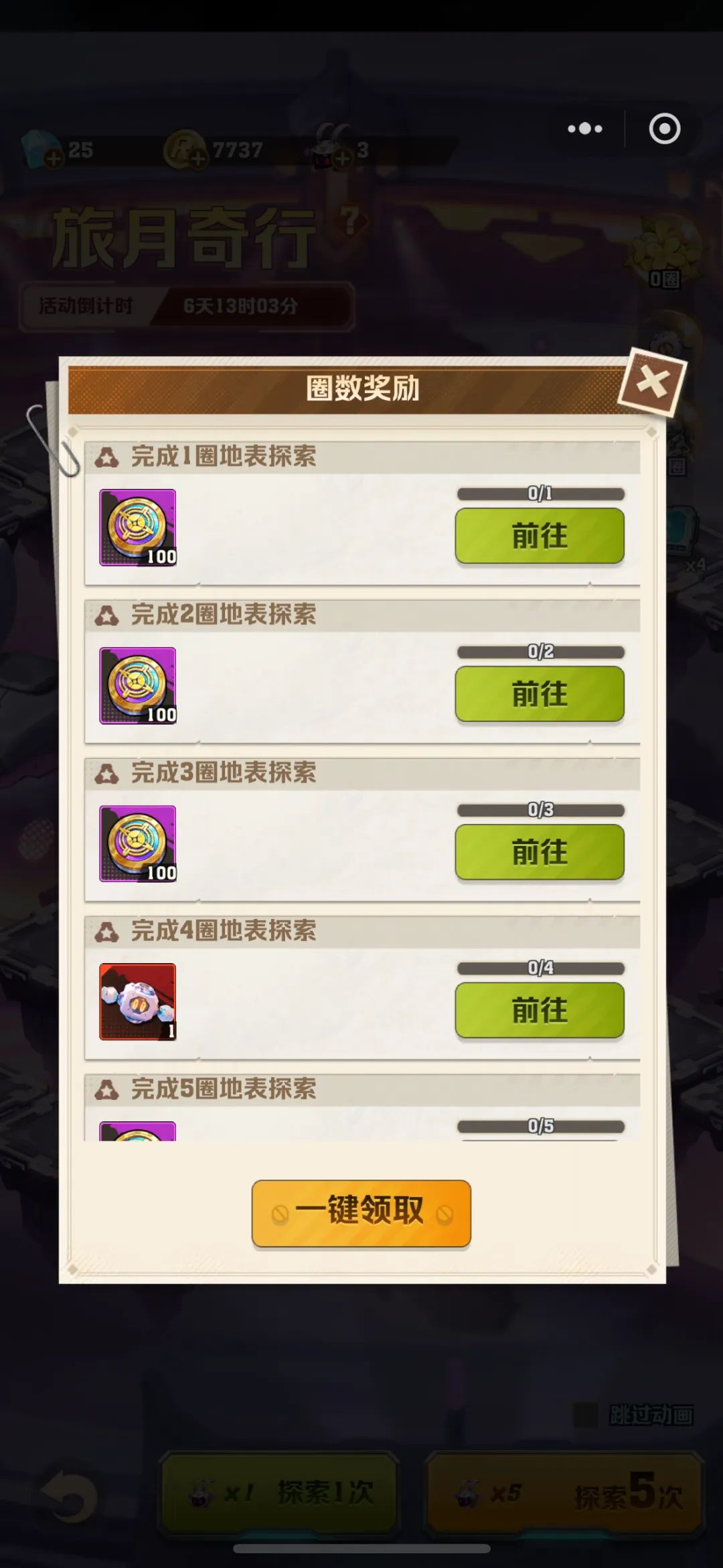 所以我们平均下来探索5次差不多13点左右,差不多一圈在1800钻石左右;