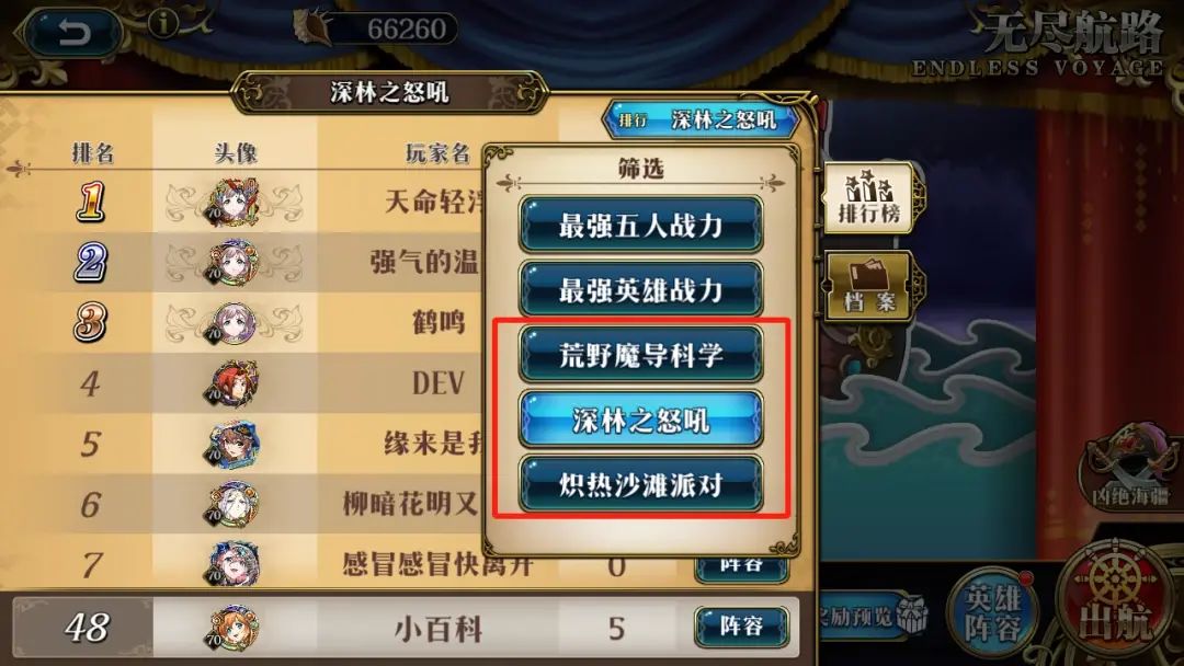 【排行榜】萌新在搭配阵容的时候不要看战力排行榜。那上面都是通关后再换高战力技能来冲榜的,完全没有参考价值。如果非要看,可以看后面3个速通榜。