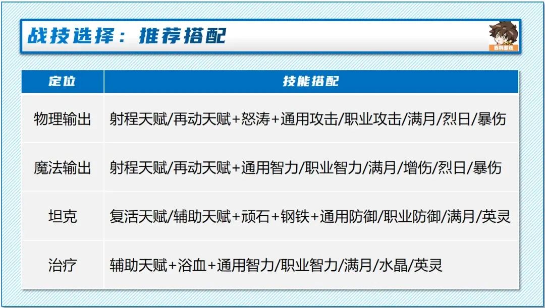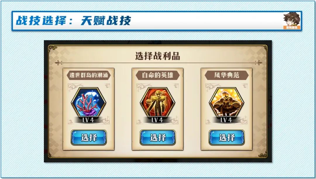 基础攻略里介绍了,越往后天赋战技的掉率越高。所以选战技的时候可以稍微往后放一下。前面先选装备,后面再选战技。天赋战技的选择原则,和选英雄基本一样。输出职业优先射程和再动。坦克优先复活和辅助光环。奶妈要求不高,优先选辅助天赋。