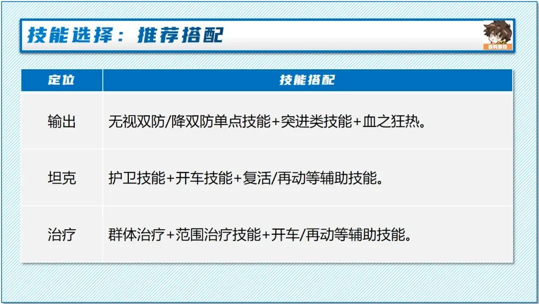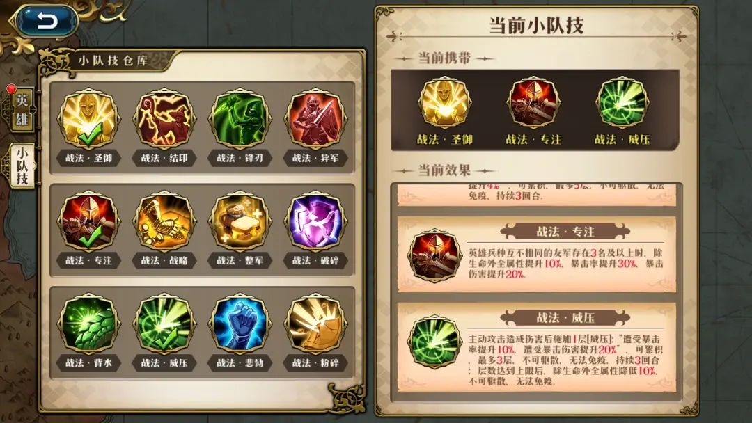除开天赋战技之外,输出英雄搭配战技时先堆属性,最好是带一个职业限定的攻击/智力,没有也可以用通用攻击/智力或者满月。然后再带增伤战技,很多BOSS有高减伤,想要强杀就必须堆增伤。如果属性和增伤都够用了,就带加暴伤的,配合暴击小队技,能明显提升伤害。物理近战英雄稍微特殊一点,一定要带怒涛,除非天赋里已经带先攻了。坦克最好是有顽石和钢铁,次选通用防御和职业限定防御,满月也可以。都没有的话也可以用生命去凑合一下。治疗一定要搞个浴血,剩下的要求不高。通用智力、职业限定智力、水晶都可以。召唤物多就建议带个英灵,配合血族很厉害。