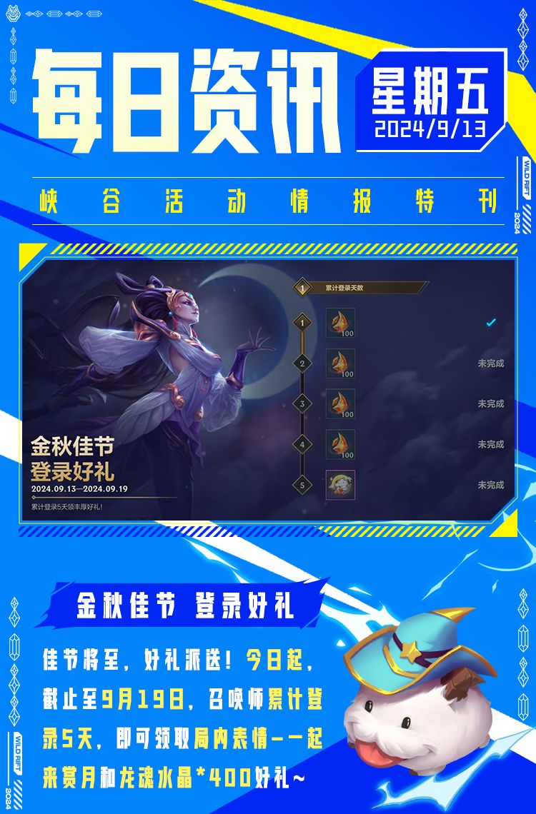 假期就要和好友一起玩转峡谷!今日起,截止至9月19日,召唤师累计登录5天,即可领取局内表情-一起来赏月和龙魂水晶*400好礼~