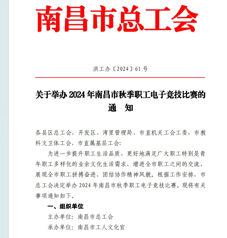 今日南昌市总工会发布红头文件,关于举办2024年南昌市秋季职工电子竞技比赛的通知,举办时间为2024年9月至12月,其中一项为黑神话悟空BOOS竞速赛。