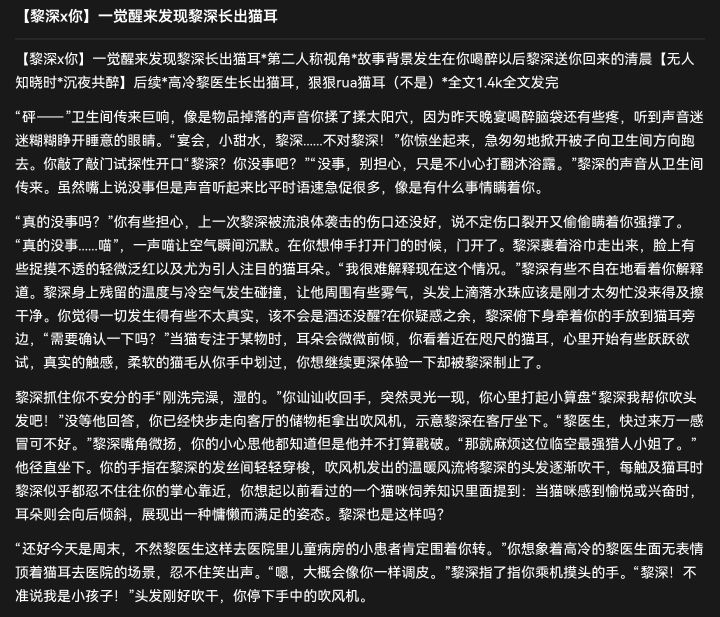 【黎深x你】一觉醒来发现黎深长出猫耳*第二人称视角*故事背景发生在你喝醉以后黎深送你回来的清晨【无人知晓时*沉夜共醉】后续*高冷黎医生长出猫耳,狠狠rua猫耳(不是)*全文1.4k全文发完