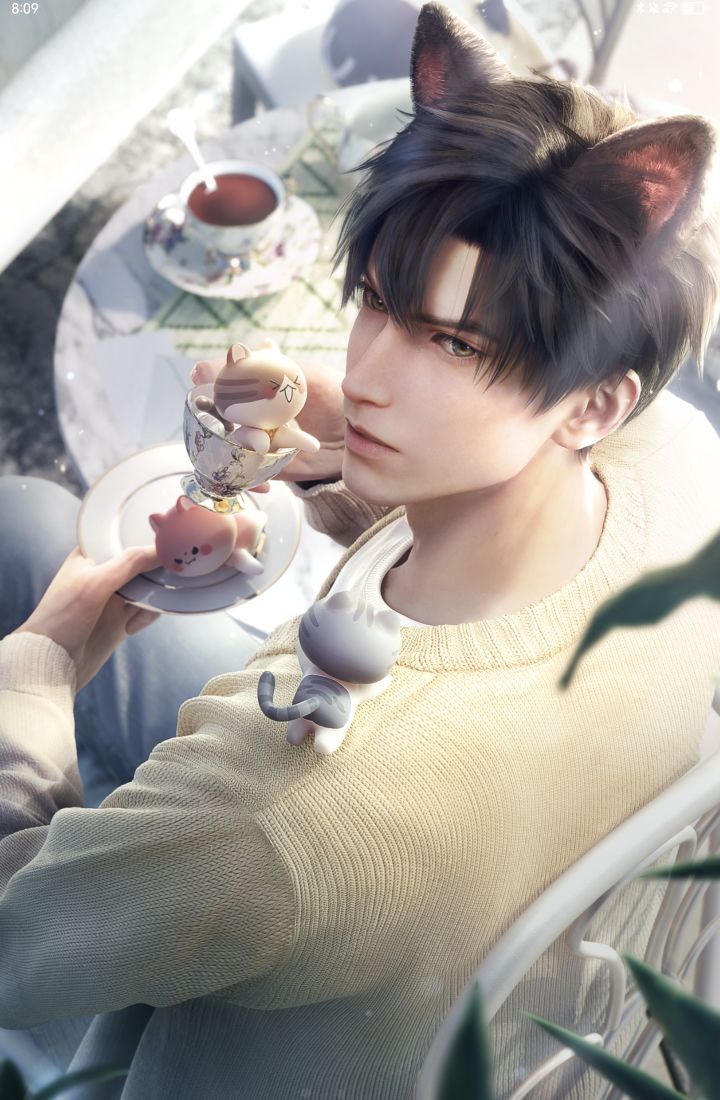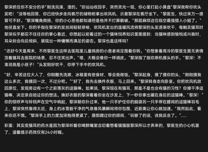 “真的没事吗?”你有些担心,上一次黎深被流浪体袭击的伤口还没好,说不定伤口裂开又偷偷瞒着你强撑了。“真的没事......喵”,一声喵让空气瞬间沉默。在你想伸手打开门的时候,门开了。黎深裹着浴巾走出来,脸上有些捉摸不透的轻微泛红以及尤为引人注目的猫耳朵。“我很难解释现在这个情况。”黎深有些不自在地看着你解释道。黎深身上残留的温度与冷空气发生碰撞,让他周围有些雾气,头发上滴落水珠应该是刚才太匆忙没来得及擦干净。你觉得一切发生得有些不太真实,该不会是酒还没醒?在你疑惑之余,黎深俯下身牵着你的手放到猫耳旁边,“需要确认一下吗?”当猫专注于某物时,耳朵会微微前倾,你看着近在咫尺的猫耳,心里开始有些跃跃欲试,真实的触感,柔软的猫毛从你手中划过,你想继续更深体验一下却被黎深制止了。