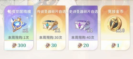 • 【竞技商店-巅峰币】徽章觉醒精魄>传说圣器碎片自选>史诗圣器碎片自选>竞技金币