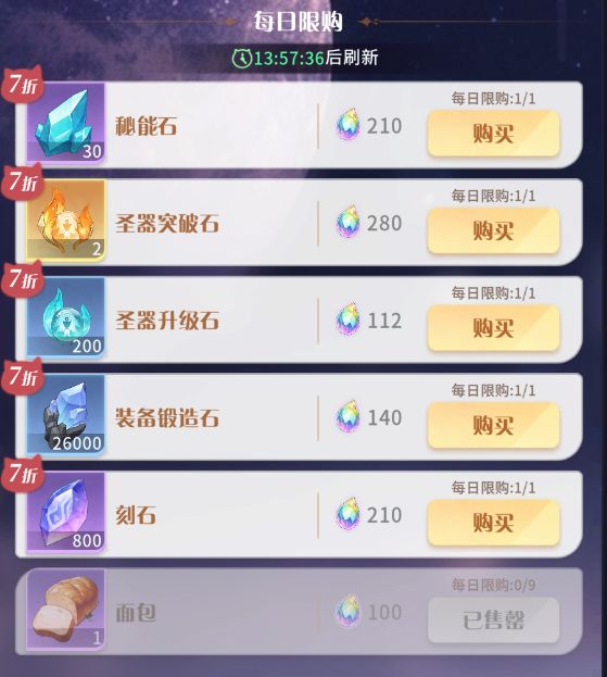 • 【神秘商店-每日限购】每日补充体力,购买9次,第一次免费,建议每次买满,共花费590星钻,装备锻造石,刻石,前期比较稀缺,建议每日购买,需花费360星钻,秘能石,圣器突破石,圣器升级石,后期用的挺多,根据星钻存量酌情购买。